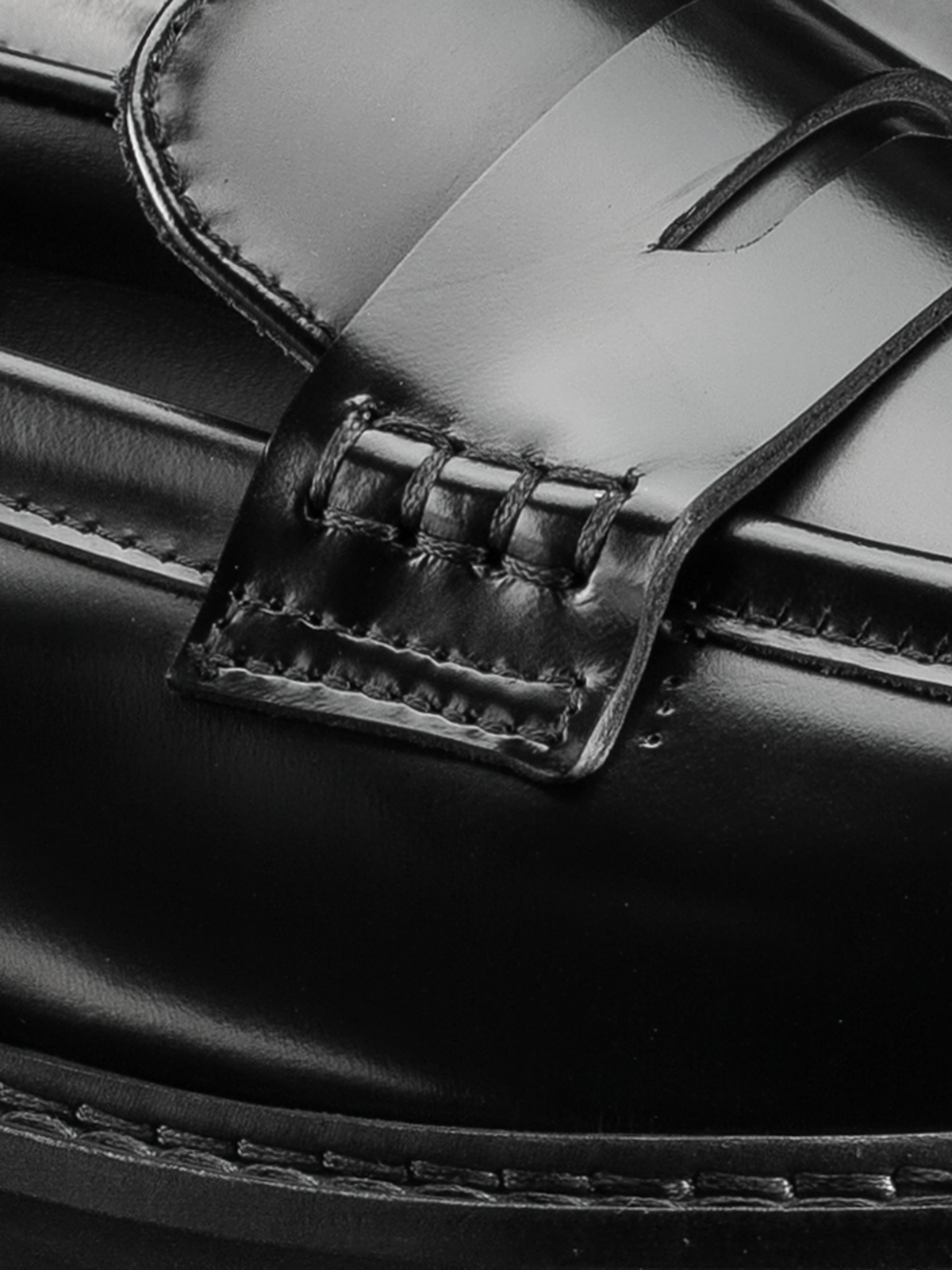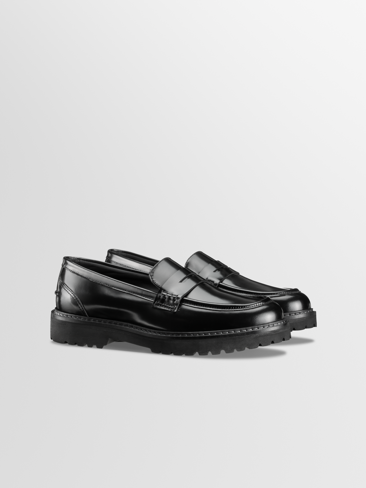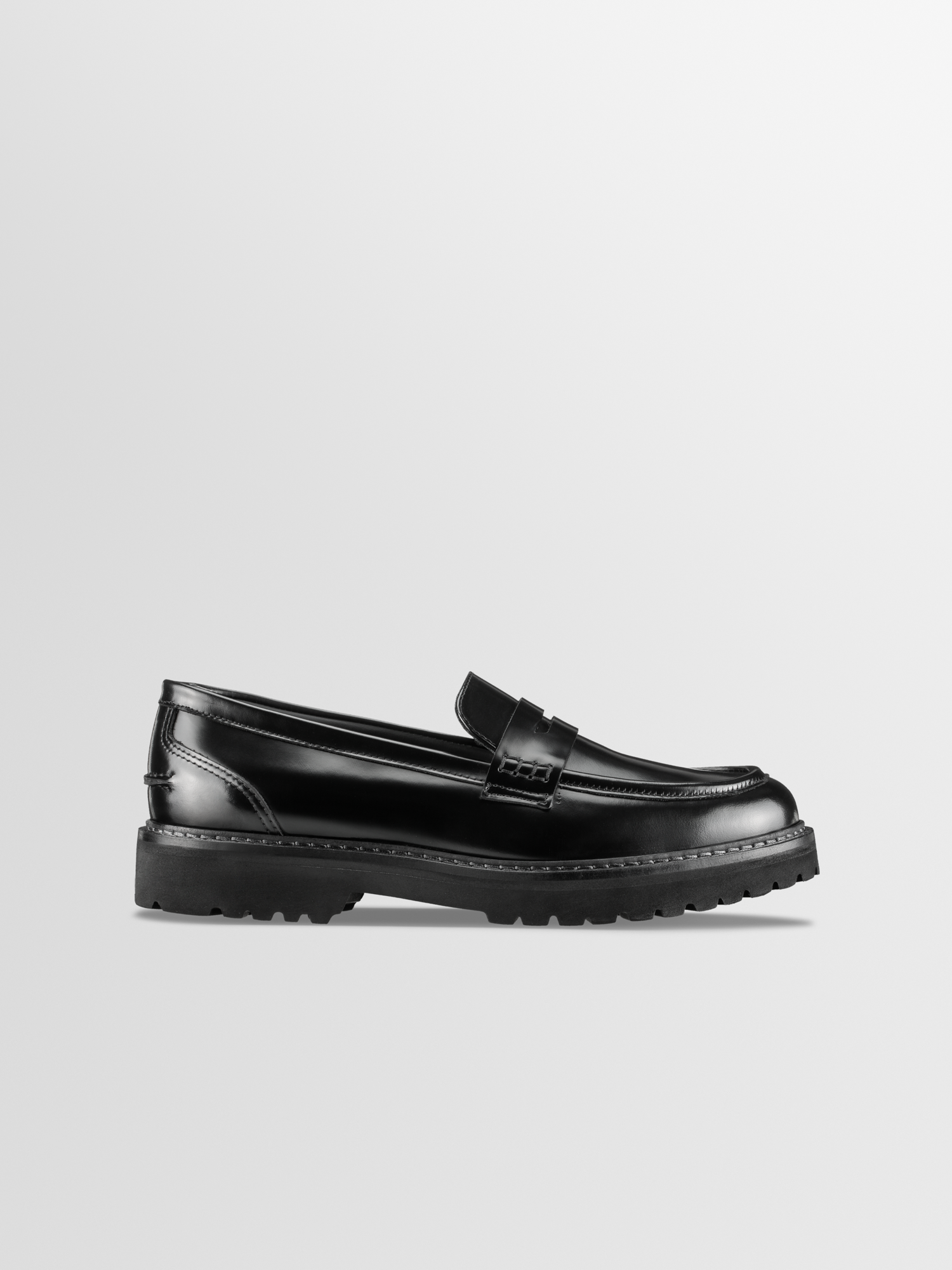 The Arezzo's chunky lug sole lends the classic loafer silhouette a cool, bold look. Handcrafted in Italy from smooth Nero Italian leather, it has a penny slot at the vamp and exposed hand-stitching along the collar.