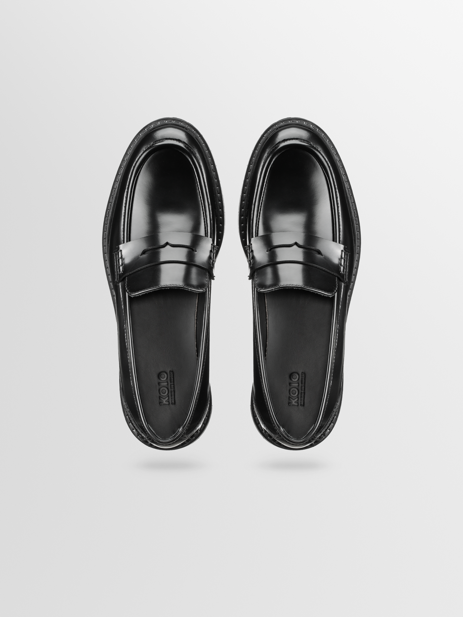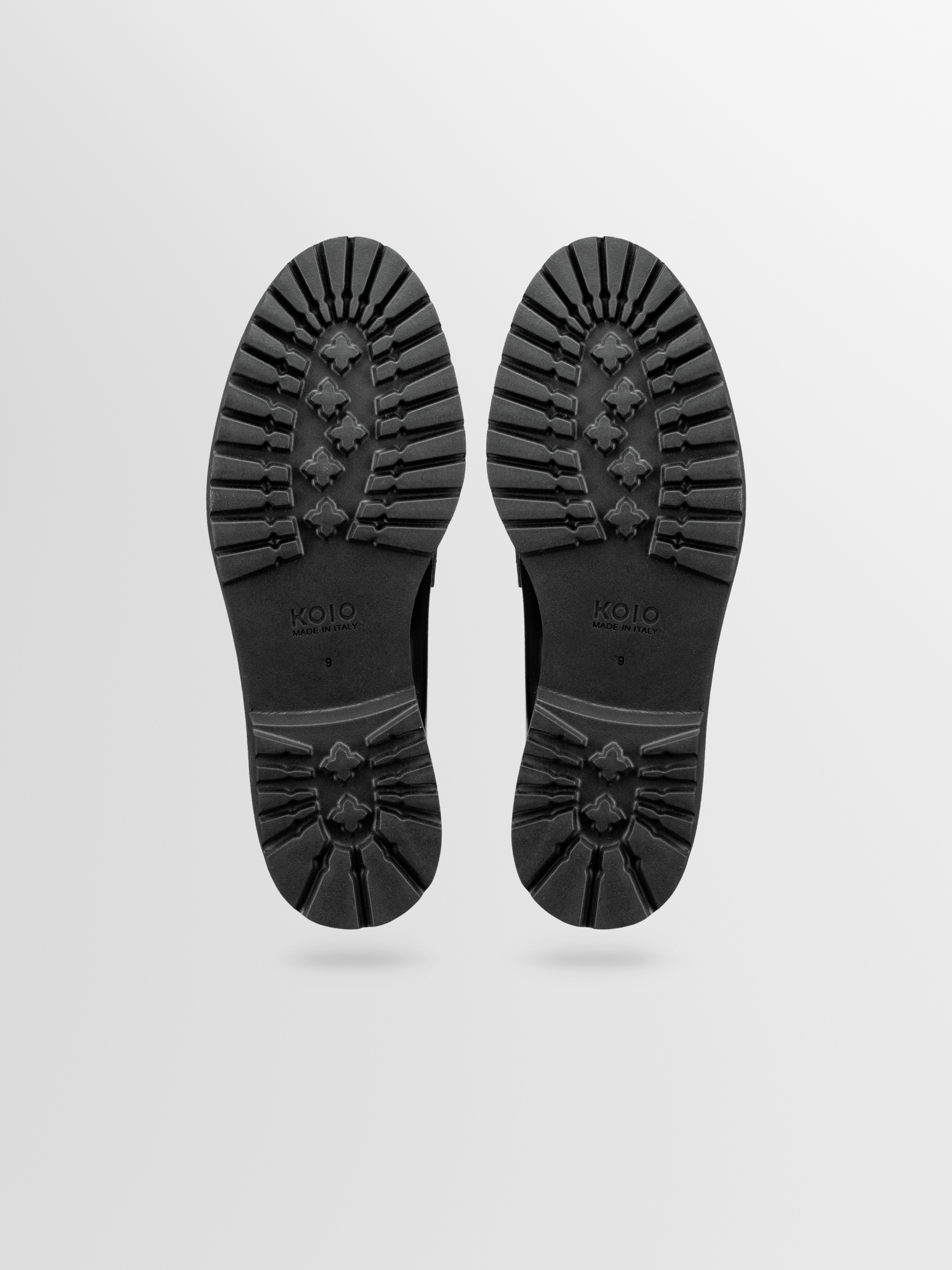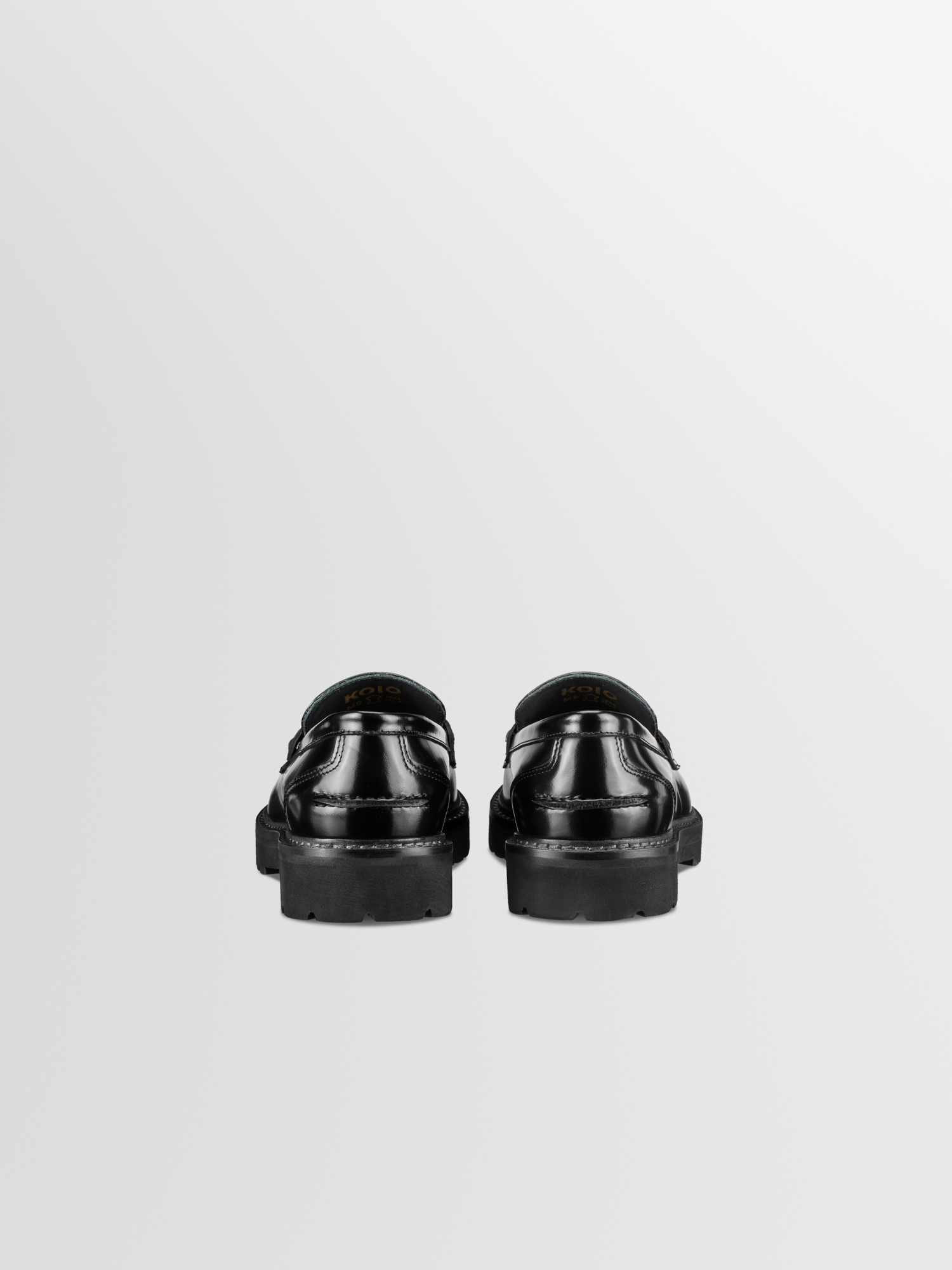 The Arezzo's chunky lug sole lends the classic loafer silhouette a cool, bold look. Handcrafted in Italy from smooth Nero Italian leather, it has a penny slot at the vamp and exposed hand-stitching along the collar.