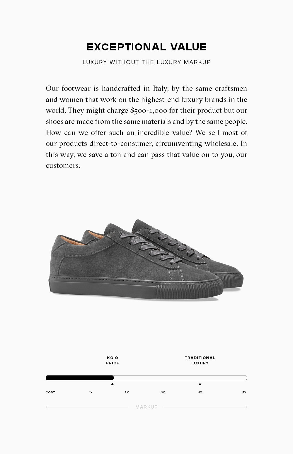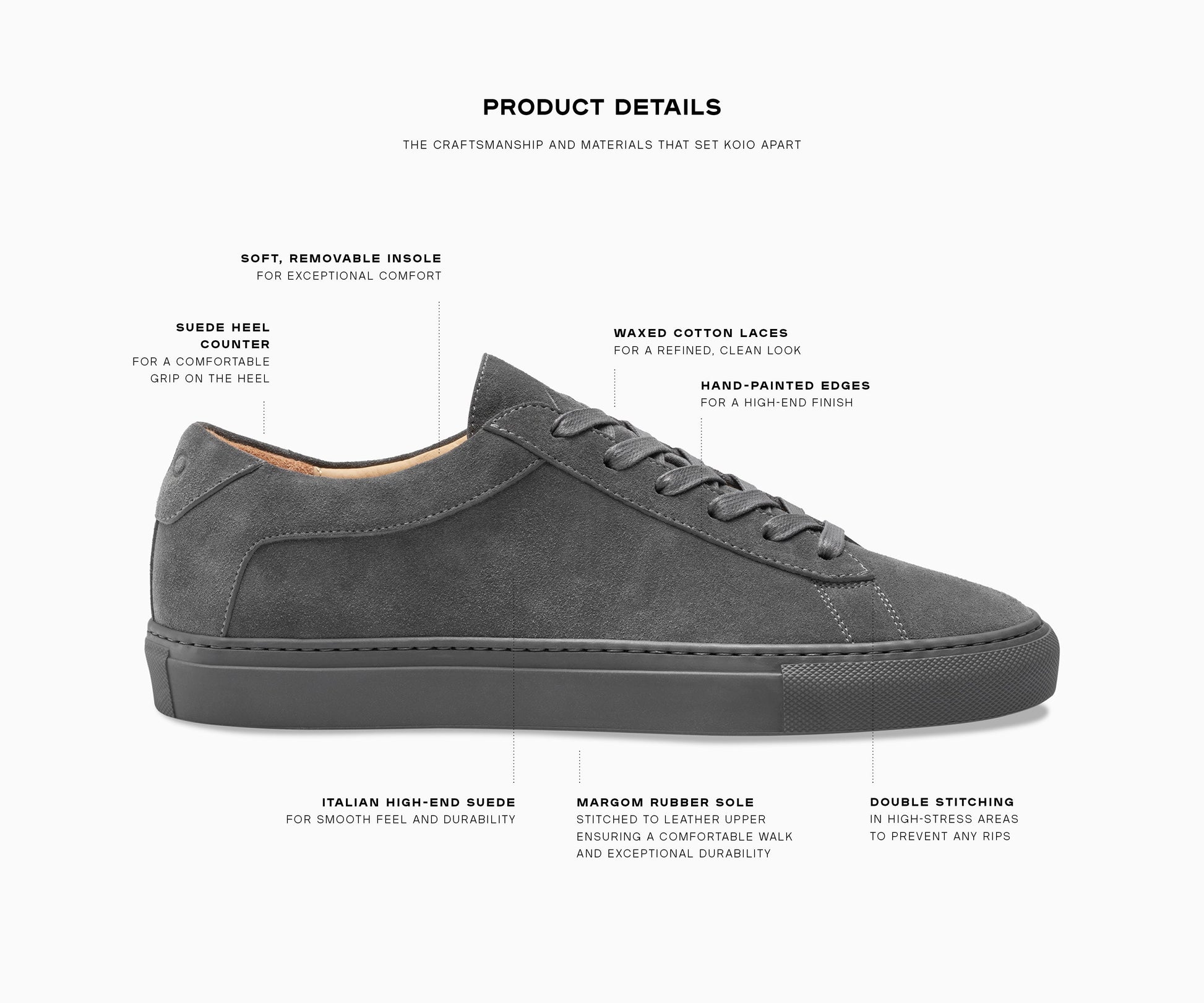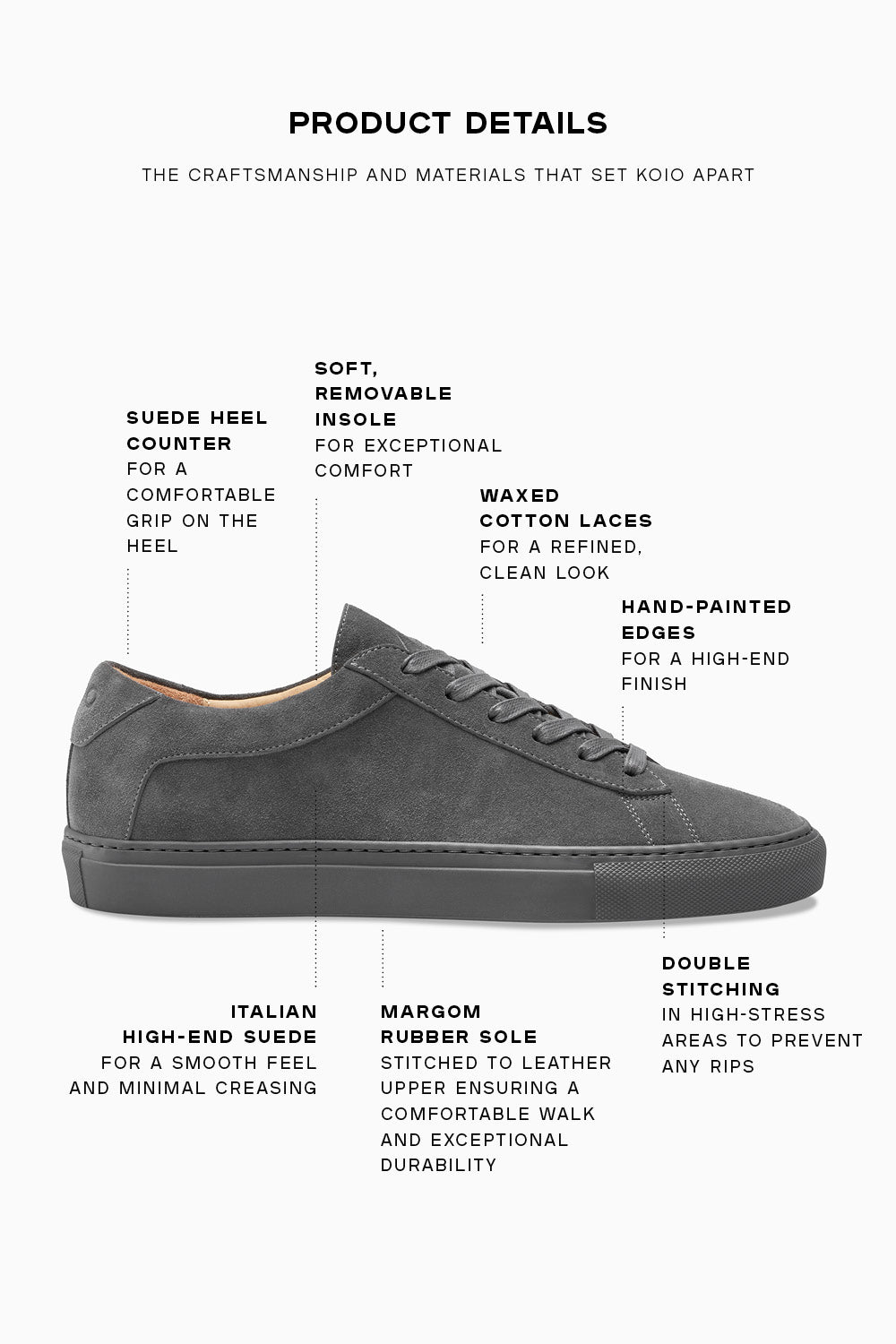 The suede’s dynamic texture thrives in rain or shine, the office or the club. We've been wearing our grey suede sneakers for years and they still turn heads because you need men’s suede sneakers that are built to last. Between the color and material, you can’t go wrong with these grey suede sneakers. Men’s sneakers won’t be the same. The Capri Roccia is KOIO’s magic suede shoe.