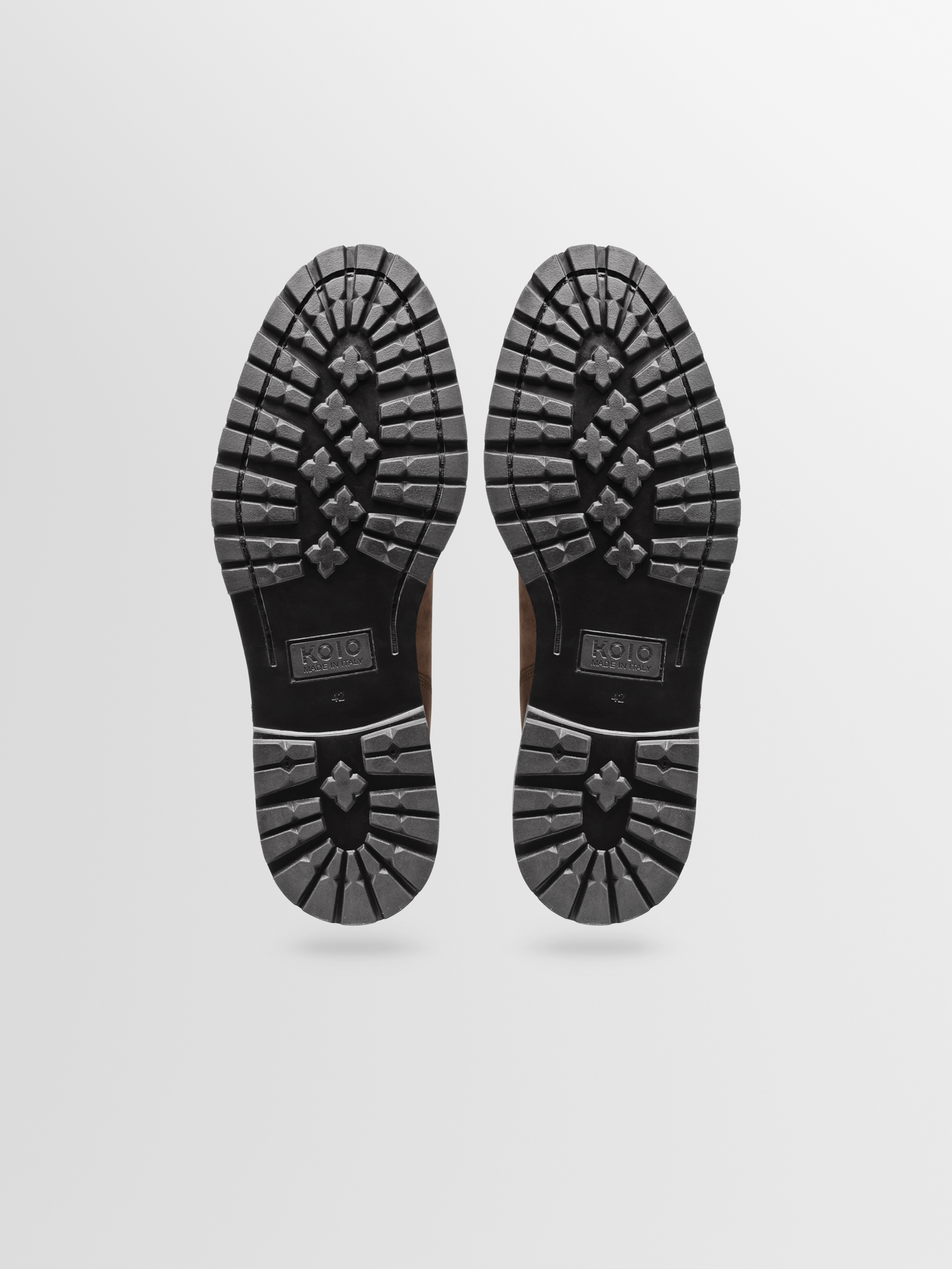 - Set on a stacked leather and rubber Koio PerformLug™ sole