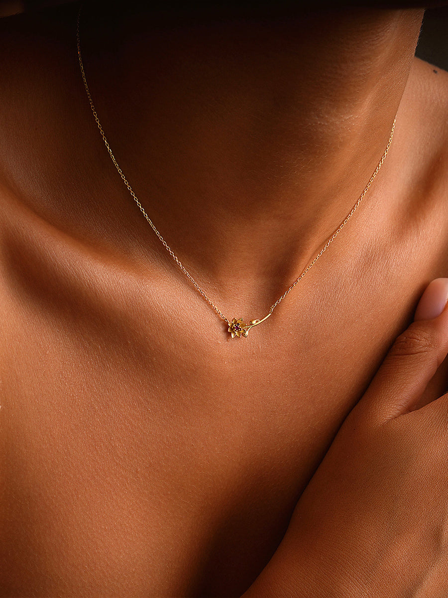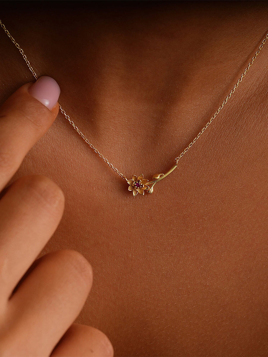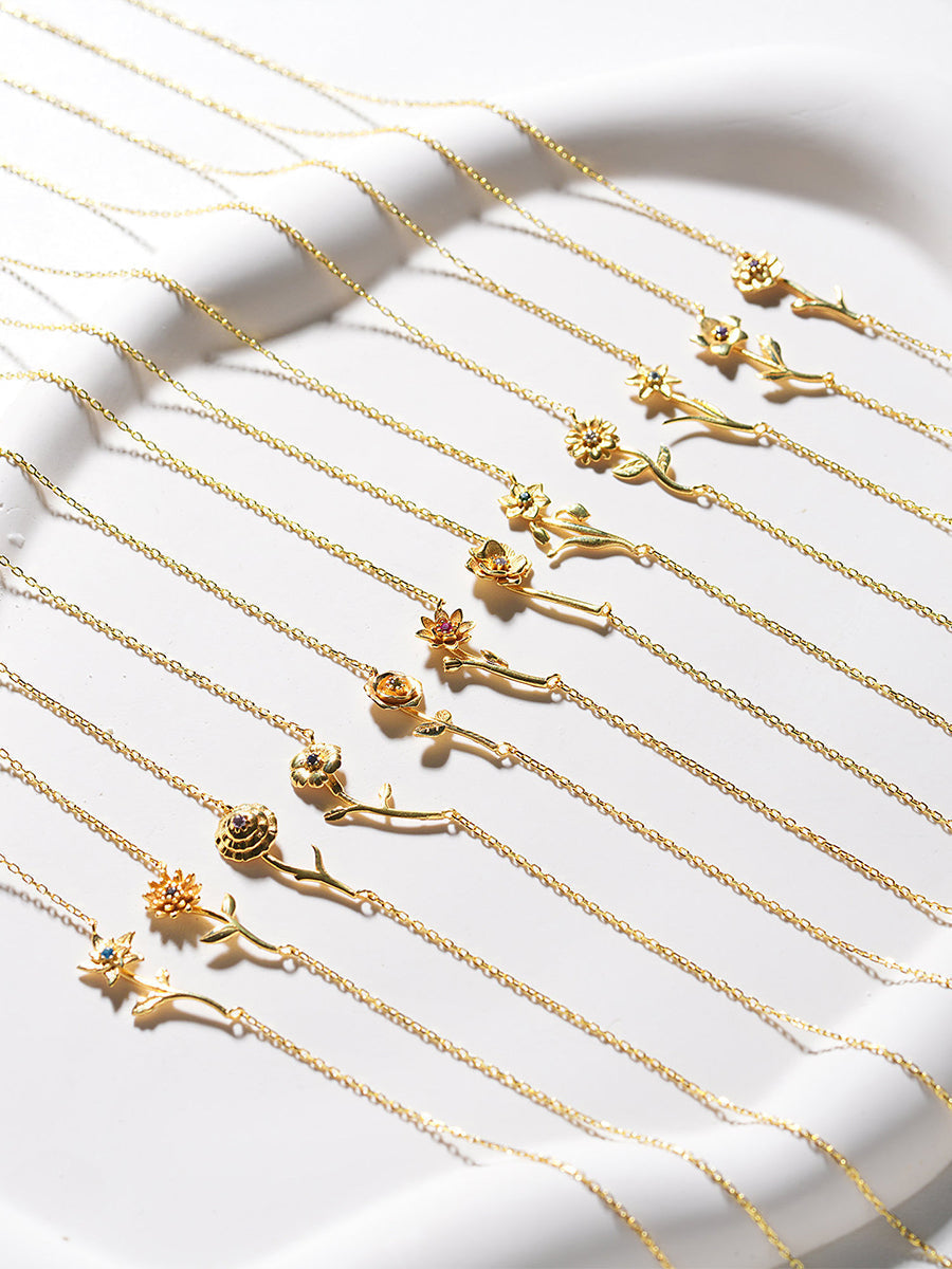 Celebrate individuality with the Flora Birthstone Necklace. Each pendant is crafted to reflect a birth month flower, accented with its matching gemstone for a personal touch. Whether worn as your own symbol or given as a heartfelt gift, it's a piece designed to hold sentiment, beauty, and timeless charm.