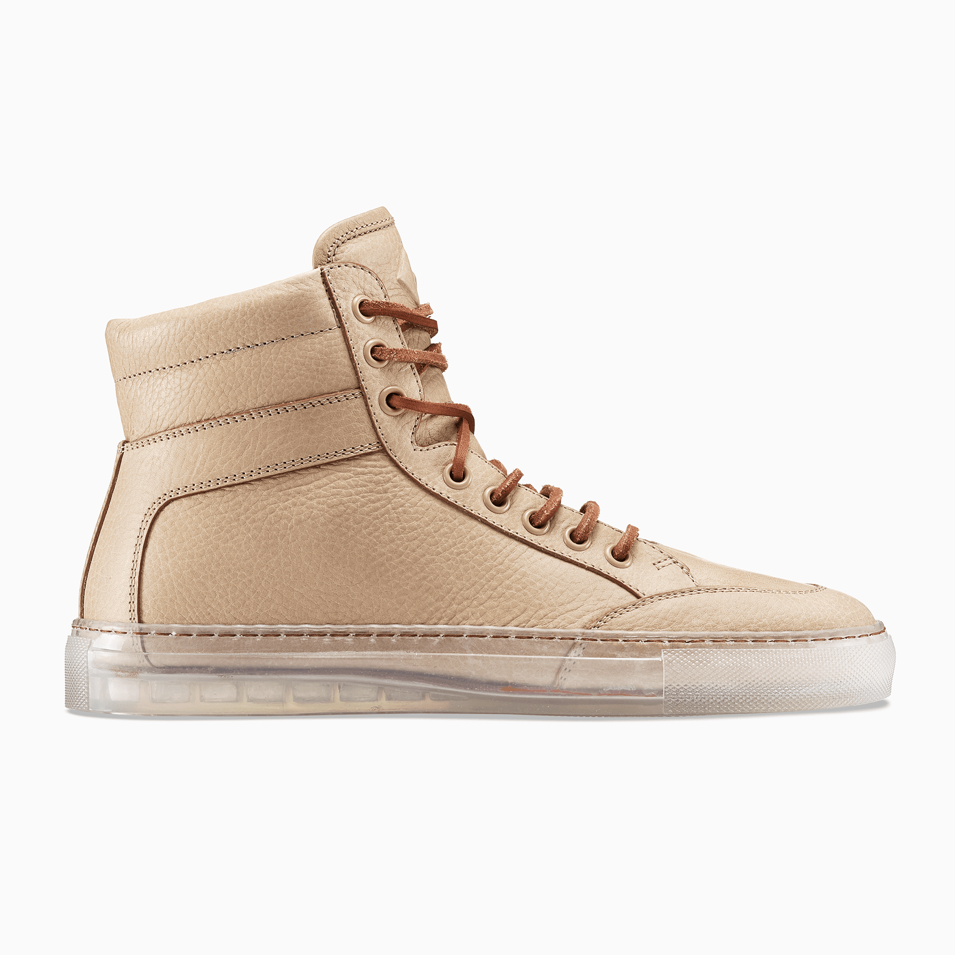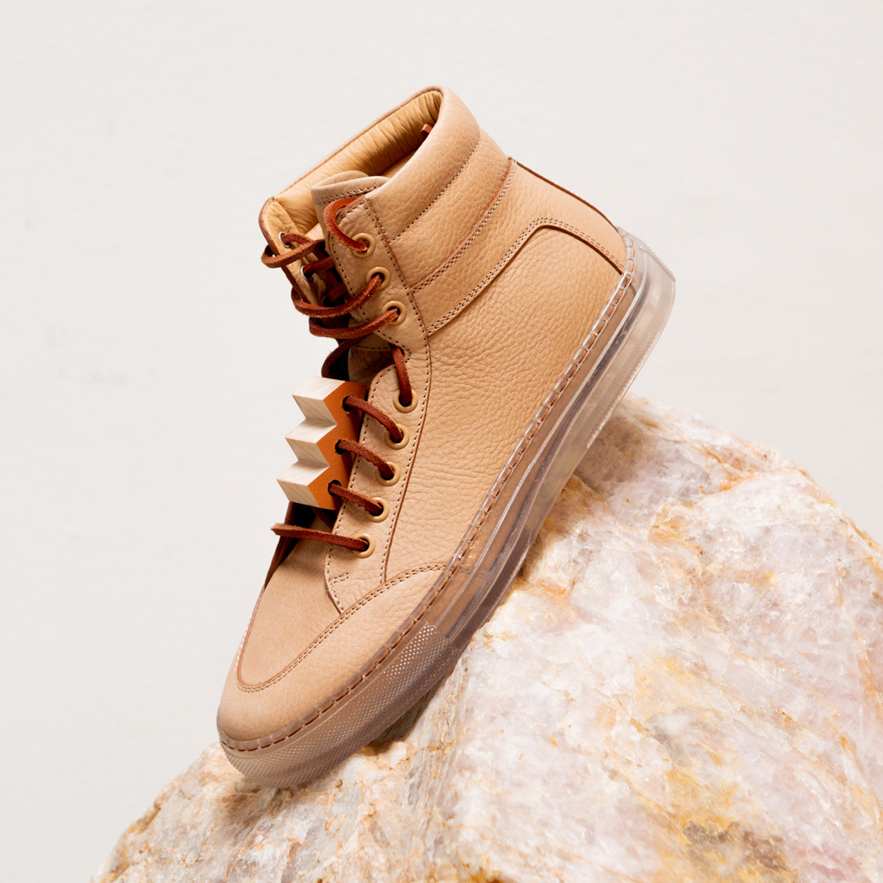 The Koio x Bradley Duncan is a collaboration with the L.A.-based sculpture artist. Bradley is renowned for his simplified geometric forms crafted from organic materials. His refined expressions demonstrate the enormous strength of both minimalist tradition and time-honored craftsmanship. In a similar vein is the Primo, featuring a transparent sole, leather laces, light brown pebble leather, plus an original Bradley Duncan WAVEFORM included on the upper that is removable.
