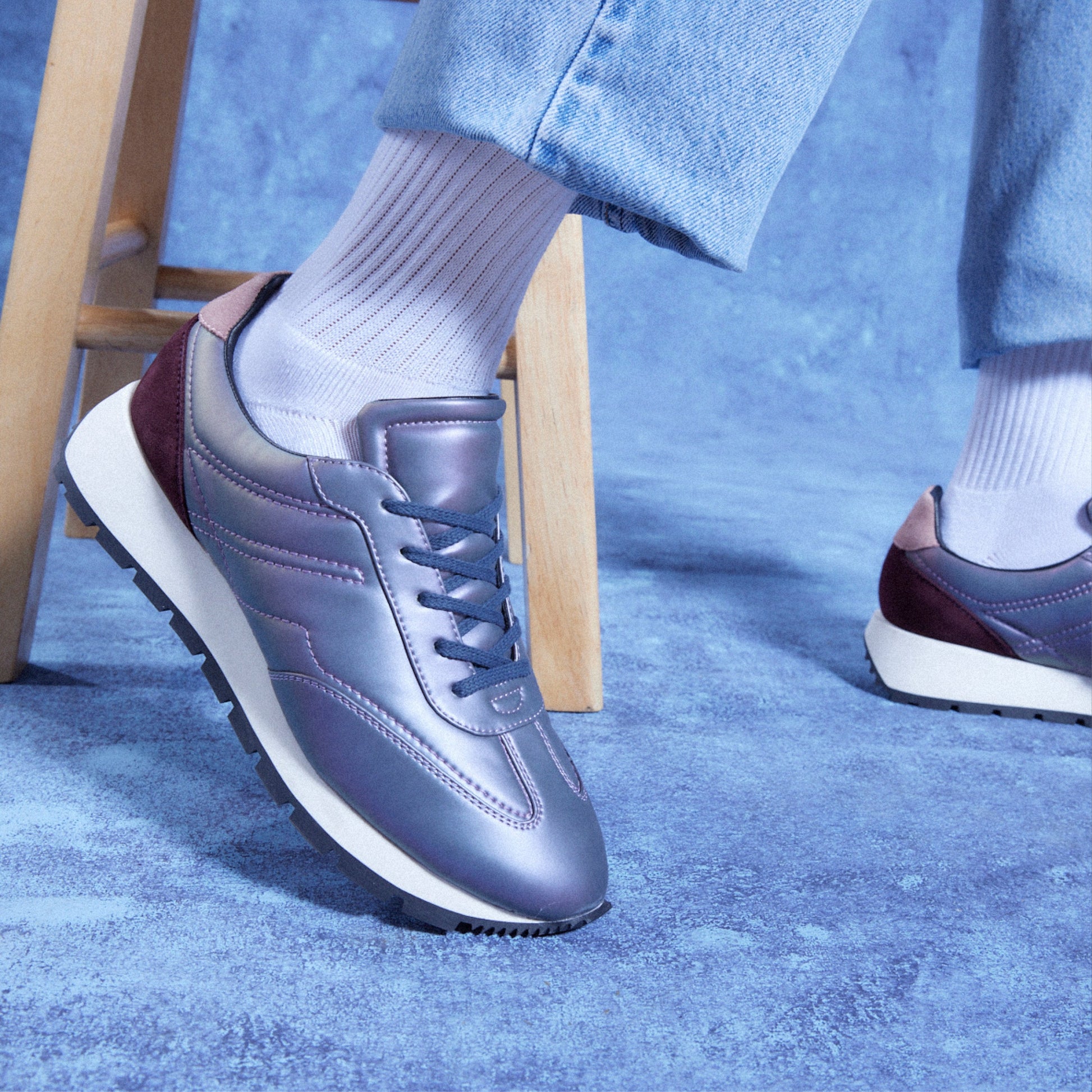 Picture this: It’s 1985, and your class is voting for senior superlatives today—you’re guaranteed to get voted ‘Best Dressed’ when everyone sees you wearing the Koio x Joe Jonas Retro Runner. Featuring an iridescent upper inspired by the 1982 film “Tron,” it’s trimmed with LWG Gold-Certified suede and set on a Koio ReCycled™ sole for unparalleled comfort. You’re going to look so rad.